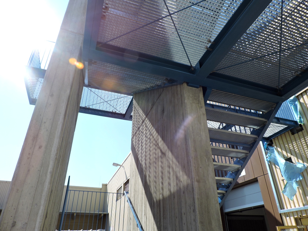 Austausch des Bodens, Abriss einer alten Fahrzeugwage und der anschliessende Bau einer Stützwand sowie zweier Wandscheiben. Diese dienen der Montage einer Stahltreppe, die als Fluchttreppe aus dem Gebäude dient. Herausfordernd war es die Einbauteile, an die die Stahltreppe anschliesst, passgenau in die Wand mit einzubinden.